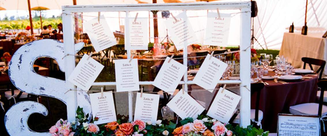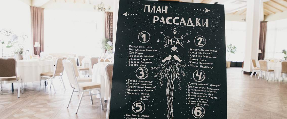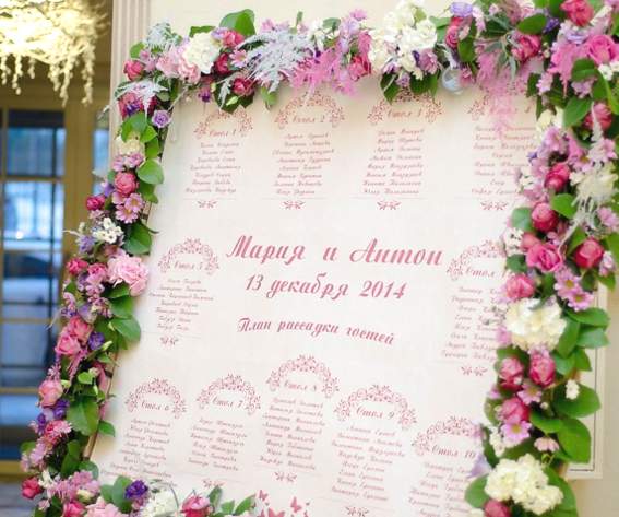 4. План рассадки гостей стал не только важным организационным моментом, но и одним из неотемлемых аксесуаров современной свадьбы. Размещается он, как правило, на входе банкетного зала. Таким образом, гости не ищут где бы сесть. Каждый может посмотреть за каким из столиков находится его место и без суеты занять его. Схему рассадки гостей лучше прописывать в алфавитном порядке с поименным перечислением.